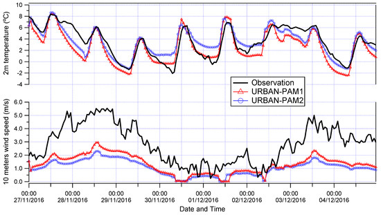 Nowadays, around 55% of the world’s population lives in urban areas, and this number is expected to increase by 68% by 2050. The European Environment Agency annual report has pointed out around 25% of the European urban population are exposed to air quality exceeding the European Union air quality standards [1], and air pollution is the leading preventable risk factors for premature death in Europe, being responsible for 400,000 deaths per year directly or indirectly. In addition, built-up surfaces that are mainly composed of artificial buildings and cement pavement which are clearly distinguished from natural surfaces favor heat accumulation [2,3]. Recent research shows that in urban regions, Urban Heat Islands (UHIs) can be observed by a difference of about 1.5–2 °C compared to rural area temperatures, and about 2.0–2.5 °C difference can be observed over densely built-up areas [4]. The UHI has a negative effect on the planetary boundary layer (PBL) height [5] and surface wind speed, which affects the transport and dispersion of pollutants. Overall, the UHI changes the local atmospheric dynamic [6], significantly influences local air pollution, reduces visibility, increases water usage, and enhances heat-related morbidity [7,8]. In modeling studies, detailed information on urban parameters is critical for the simulation of the UHI effect. Studies conducted in Taiwan have found that the urban canopy model can improve the prediction of UHI intensity, boundary layer development, land–sea breeze [9], and precipitation [5]. Air pollution prediction is crucial in order to inform a large fraction of the population and take adequate short- and long-term measures to improve air quality. The use of air quality modelling tools at high resolution is now common but remains a challenge, because buildings create local modifications in air flows and modify surface energy budgets and roughness, leading to very complex processes which make air quality simulation particularly difficult in the near-ground layers [10,11,12,13]. Chemical transport models usually require numerical weather prediction (NWP) models, which provide meteorological input data [14,15]. High-resolution urban canopy parameters databases are becoming more and more available for cities [16,17]. NWP models with different physics parameterizations have been widely used in recent decades to simulate air quality over urban regions, especially the widely used community mesoscale Advanced Research Weather Research and Forecasting (ARW-WRF) model. Studies show that physics parameterizations play a critical role both in meteorological and air quality simulation or forecast [18,19,20,21,22]. For example, the Planetary Boundary Layer (PBL) height is determined by the heat and momentum exchanges between the PBL and the surface. In meteorological models, the PBL height is calculated by the PBL scheme. Therefore, the PBL scheme is a crucial factor in simulating the formation and evolution of air pollution [23,24,25]. Studies on different PBL parameterization schemes have shown that an accurate description of the meteorological conditions within the PBL via an appropriate parameterization scheme is important for air pollution modeling [26]. Some studies have presented the influences of meteorological models on pollutant concentrations; they estimate that uncertainties of PBL heights from the different models are one of the major sources of the differences in Particulate Matter (PM) concentrations [27,28]. Kleczeket et al. [29] compared three non-TKE (Turbulent Kinetic Energy) schemes and four TKE closures schemes; they found that non-TKE schemes tend to produce higher temperatures and wind speeds than in TKE schemes, especially during nighttime. Barlage et al. [13] also had a similar result between TKE and non-TKE schemes at night and found that PBL schemes have little effect on model performances in urban locations during daytime. Some other studies indicate that most PBL schemes slightly overestimate near-ground wind speed [30]; a possible reason could be the omission of the effect of unresolved topographic features on the momentum flux [31].