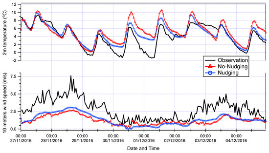 The urban canopy model in the WRF simulation affects the modeling of several important meteorological variables for air quality issues (e.g., 10 m wind speed W10, 2 m surface temperature T2, and PBL height). It changes the vertical distribution of atmospheric pollutants by modifying the boundary layer height and mixing. Geometric and thermal parameters, including anthropogenic heat, thermal conductivities, and heat capacity, have a significant effect on the transfer of momentum between the atmosphere and urban surface [52]. However, the representativeness of these parameters aggregated over a CTM grid cell remains highly uncertain, especially with a limited number of urban land-use types. The urban parameters (Table S1) used here are based on a previous study in Paris region [53,54] and default urban parameterization (URBPARM). The TBL tables in the WRF code are defined as URBAN-PAM1 and URBAN-PAM2, respectively. The RRTMG shortwave and longwave radiation scheme, MO similarity surface layer scheme, Noah land surface model, BEP urban canopy model, and MYJ boundary layer scheme are used for all simulations in this section. Figure 3 presents the time series of hourly-averaged T2 and W10 at Sirta station. The results show that simply modifying the values of the parameters has a strong impact on the outputs. The T2 presents a more positive correlation (0.86 than 0.81) in URBAN-PAM1 than in URBAN-PAM2, while the W10 has a more negative bias (−1.51 m than −1.42 m s−1) in URBAN-PAM1 than in URBAN-PAM2. A weak spectral nudging above the boundary layer for all the domains is also tested in this part. Figure 4 indicates that the spectral nudging technique is effective in improving the model skills. The performance benefits in Paris from the assimilation of meteorological data at Roissy airport in the global meteorological fields. Thus, URBAN-PAM1 and spectral nudging are used for all our sensitivity tests, which are discussed in the following sections.