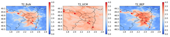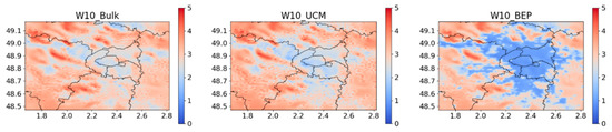 Figure 8 shows the maps of the averaged W10 simulated for the Bulk, UCM, and BEP schemes in this period. All the schemes give a higher surface wind speed in rural areas than in urban regions; the Bulk scheme shows the weakest gradient from urban to rural areas, with a negative bias for 0.51 m s−1; UCM gives a relative higher negative bias than Bulk from 1 to 2 m s−1; and the BEP scheme had an obviously strongest impact from cities, displaying a negative bias around 3.5 m s−1. The comparison between the observations and models for W10 are displayed in Figure 9. The observed W10 varied between 0.6 m and 7.6 m s−1, 0.1 m and 9.4 m s−1, and 0.2 m and 5.5 m s−1, with an average of 2.3 m, 1.5 m, and 2.8 m s−1 in three meteorological observation stations (Montsouris, Roissy, Sirta), respectively. Both the observed and modelled W10 display much lower values during the PE than the RD. In contrast with the T2, the W10 does not display remarkable differences between stations. The BEP scheme tends to produce the lowest W10 throughout the whole period for all the stations. Bulk and UCM performed well for both the PE and RD. A possible reason could be due to the roughness length, which is not directly dependent on urban morphology for the UCM scheme, while the momentum sinks and drag force estimated by the BEP scheme depend on urban morphology in this study. Low wind speed leads to weak natural circulation and the accumulation of heat in the lower urban boundary layer, which in turn enhances the warming of the urban area [55]. This would explain why BEP has a relative higher T2 simulation than the other schemes during the PE. This sensitivity test indicates that more realistic urban morphologies are needed to improve the model performance, because the parameters used in the urban canopy scheme (e.g., albedo, heat capacity, and roughness length) strongly influence the surface energy balance and heat absorption.
