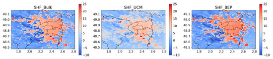 The RRTMG shortwave and longwave radiation schemes, the MO similarity surface layer scheme, and the Noah land surface model are used for all the simulations in this section. The whole period (27th November to 4th December 2016) is divided into two periods: a Particulate matter Episode (PE) from 30th November to 2nd December; and other days than the PE, which are defined as regular days (RD). No rainfall occurred over both then PE and the RD. Figure 5 presents the maps of averaged T2 simulated based on the Bulk, UCM, and BEP schemes in this period. All the schemes show a higher T2 in the urban region than the rural, and the BEP scheme displays the strongest UHI effect in the urban region, which gives a positive bias of up to 1 °C compared to the other two schemes. The Bulk and BEP schemes perform similarly in rural areas and display a negative bias (1–3 °C by Bulk and 1–4 °C by BEP) compared with urban areas, but the UCM scheme gives the highest T2 in rural areas, displaying a negative bias of about 0.5–1 °C compared with urban regions. A possible reason could be the overestimation of surface heat flux (SHF) in the rural areas. Figure 6 presents the averaged SHF in this period. The Bulk and BEP schemes display obvious differences between urban and rural regions, with a negative bias (around −25 to −35 W m−2) in rural compared to urban areas. The UCM scheme just produces a negative bias of −10 and −15 W m−2, respectively, in rural and urban areas, which could give an explanation of the overestimation of T2 in rural areas.
