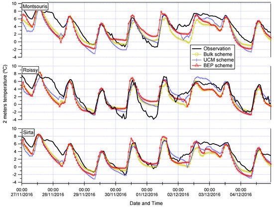 Results at the three meteorological stations are compared with the observations to evaluate the canopy scheme’s performance. Figure 7 presents the time series of hourly-averaged T2 during the whole period. The observed T2 varies between −1.4 and 9.3 °C, −3.9 and 7.8 °C, and −2.1 to 8.4 °C, with an average of 4.0, 2.6, and 4.9 °C at Montsouris, Roissy, and Sirta stations, respectively. Compared with the observations, all three schemes tended to underestimate the T2 during the period 16:00 p.m.–10:00 a.m. UTC on the 27th and 28th for all stations, while higher positive values were observed around midnight of the 1st December for Montsouris and Roissy stations, especially at Roissy, with a positive bias from 1.8 to 4.9 °C during the PE. The BEP scheme simulates relatively higher T2 at PE for all the stations because the BEP scheme simulates a stronger UHI than the other two schemes. All the schemes have the best performance at the Sirta site. Compared with the observations from three stations, the differences in the modelled T2 are minimal between three stations during the PE. However, there are significant differences in the observed T2 between the stations. For example, the minimum observed T2 are −1.4, −3.9, and −0.3 °C during the midnight of 1st December at Montsouris, Roissy, and Sirta stations, respectively. A possible reason could be the use of a single urban category in our WRF simulations, but in the real environment Montsouris and Sirta stations are closer to commercial and residential areas and Roissy is a synoptic station close to the airport, which could be assimilated as a rural environment with a weaker UHI effect, especially during nighttime.