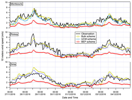 Comparison of the time series of 10 m wind speed (m s−1) between the observations and different urban schemes at Montsouris, Roissy and Sirta stations.
