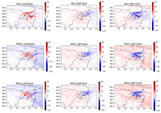 The differences in the daily averaged NO2 (μg m−3), PM2.5 (μg m−3), and PM10 (μg m−3) between different schemes from 27th November to 4th December 2016.