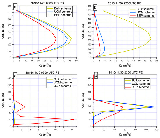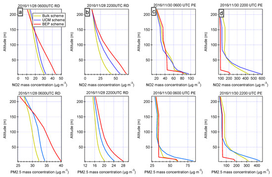 In this study, NO2, PM2.5, and PM10 concentrations are used to evaluate the impact of physics parameterizations on air quality simulations. NO2, which comes mainly from automobile exhaust emissions in cities, is selected to be an indicator of local pollution. Comparing the evolution and spatial patterns of NO2 versus the PM2.5 and PM10 gives an indication of the local contribution during this episode. Figure 10 presents the differences in pollutants distribution between each canopy scheme. The results show that, compared to the Bulk scheme, the pollutant concentrations from the BEP scheme were lower in the city center, but displayed an opposite behavior compared to the UCM scheme. The UCM scheme displayed higher pollutant concentrations in the urban area and lower pollutant concentrations in rural areas. Figure 11 presents the time series of NO2 mass concentrations for all the experiments compared to the observations for the four stations (the time series of PM2.5 and PM10 mass concentrations can be found in Figure S1). The average biases of the four stations is given in Table 2, and the time series of the biases are displayed in Figure S2. The results show that the BEP scheme gives the best performance for almost the whole period, especially during the PE. All the schemes can effectively predict air pollution during the RD, but they usually overestimate pollutant concentrations for all the stations during the PE; all the schemes had their worst performance in NO2 prediction, which means that the canopy schemes do not simulate well the emission of local air pollution. Figure 12 gives the vertical diffusion coefficient at daytime and nighttime in the RD and PE. The Bulk scheme has the highest vertical diffusion rate among the three schemes during the RD. Figure 13 presents the vertical profile of the NO2 and PM2.5 mass concentrations under 200 m; both NO2 and PM2.5 show the lowest vertical mass concentrations at low layers by the Bulk scheme and the highest vertical mass concentrations by the BEP scheme during the RD, which agrees with the vertical profile of Kz in CHIMERE. At 06:00 UTC on 30th November, the Kz displays very low values at ground layers for all three schemes, but rises rapidly in the BEP scheme from the third layer. Figure 13c also presents high pollutant concentrations at the ground layer for all three schemes but decreases rapidly in the BEP scheme from the third layer. Looking at the NO2 concentrations, there is clearly an added value of using a low first model layer in the model to enhance the concentrations close to emission sources related to ground sources such as road traffic. In the models, it is more common to use a first layer of about 20 to 50 m [56,57]. Figure S3 presents the hourly timeseries of NO2 as an average of all the air quality monitoring stations between the observations and simulations, with first layers of about 4, 18, and 40 m (based on the best physics parameterizations in this study). An extremely low vertical diffusion rate leads to high concentrations of pollutants, which is one reason for the strong overestimations at the surface layers at this time. In general, the BEP scheme has the best performance among the three schemes, but all the schemes strongly overestimate the concentrations at the beginning of the PE, especially the UCM scheme. A low near-ground wind speed usually indicates low diffusion rates, which means the BEP scheme involves higher pollutant concentrations than for the other two schemes, but our study shows the pollutants concentrations is not found to be positively correlated with the W10. A possible explanation could be the underestimation of PBL height, which leads to a low diffusion rate at this period; a detail discussion about the impact of the PBL height is in the next section.