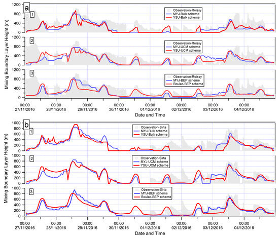 Time series of the observed and modelled mixing boundary layer height: (a) and (b) represent Roissy and Sirta station, respectively; 1, 2, and 3 represent each PBL scheme coupled with each urban canopy scheme.