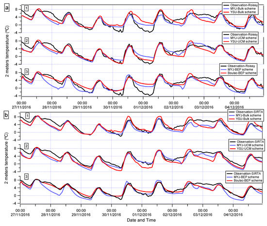 Time series between the observed and modelled T2: (a) and (b) represent Roissy and Sirta station, respectively; 1, 2, and 3 represent each PBL scheme coupled with each urban canopy scheme.