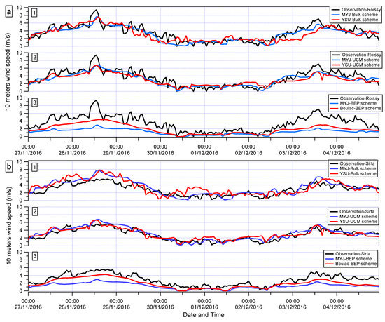 Time series between the observed and modelled W10: (a) and (b) represent Roissy and Sirta station, respectively; 1, 2, and 3 represent each PBL scheme coupled with each urban canopy scheme.