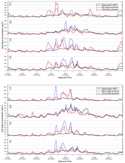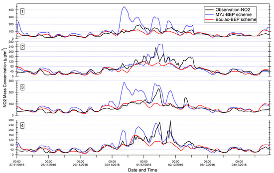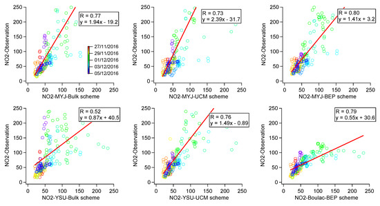 The impacts of the PBL schemes on air quality are analyzed in this section. The time series of the model predictions of the NO2, PM2.5, PM10 concentrations for all the schemes are compared with the observations (the NO2 can be found in Figure 17; the PM2.5 and PM10 can be found in Figures S4 and S5). In general, all the schemes have a better performance for the RD than the PE period, and almost all the schemes strongly overestimate pollutant concentrations at the beginning of the PE, except the Boulac–BEP scheme. The bias between the modelled and observed pollutant concentrations can be found in Figures S6–S8. All the schemes give a worse performance for NO2 and PM2.5 prediction than for PM10. The PBL height reaches the minimum value at 18:00 UTC on 29th November, with the YSU–Bulk scheme corresponding to an underestimation of 500 m; such a difference creates a large bias in air pollutant concentrations. The same phenomenon occurs for the MYJ–Bulk, MYJ–UCM, YSU–UCM, and MYJ–BEP schemes at 00:00 UTC on 30th November. However, the overestimation of pollutant concentrations does not occur at this time but at 06:00 UTC on 1st December, because this episode is largely influenced by local sources (road traffic and residential heating). On 1st December 2016 at 06:00 UTC (a weekday), the morning rush hour leads to a lag effect in the bias, explaining why all the schemes have their worst performance for the NO2 and PM2.5 predictions. The averaged statistics for the four air quality monitoring stations are summarized in Table 4. Figure 18 gives the scatterplot between the observed and modelled NO2; the scatterplot for the PM2.5 and PM10 can be found in Figure S9. Overall, the MYJ scheme overestimates the mass concentrations of all pollutants, whatever the selected urban canopy model. The Boulac–BEP scheme has a significantly better performance than other schemes for all the evaluated variables. The YSU–Bulk scheme has the lowest mean bias (−1.3 µg m−3) in PM10 prediction, but its mean linear correlation coefficients of NO2, PM2.5, and PM10 were 0.52, 0.40, and 0.53, respectively. The mean biases for the NO2 and PM2.5 prediction were 17.6 and 46.0 µg m−3, respectively. The low correlation for all the analyzed variables, positive biases for NO2 and PM2.5 prediction, and negative bias for PM10 prediction indicate that this scheme under and over-estimates the concentrations simultaneously, which means that the YSU–Bulk scheme cannot be performed effectively for the prediction of short-term PE in urban regions. The Boulac–BEP scheme was better for all the analyzed variables, both in terms of bias and correlation statistics; its mean biases for NO2, PM2.5, and PM10 prediction were −5.1, 1.2, and −8.6 µg m−3, respectively. This indicates that both the urban canopy and PBL schemes play an important role in the PE forecast for urban regions.