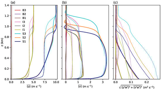 The deepening of PBL following the strength of surface thermal forcing is observed again in the vertical profiles of temporally and horizontally averaged horizontal velocities  and  and vertical turbulent momentum flux  (Figure 1). In this study, overbars and angle brackets indicate temporal (600 s) and horizontal averages, respectively, and primes denote horizontal perturbations. The 6 CBLs in the I1–3 and S1–3 cases are grouped according to mean wind velocity and PBL depth. The PBL depth can be estimated from the depth of uniform-wind-layer, and it increases with increasing surface heat flux at  (Figure 1a,b). The x- and y-directional mean wind velocities in the 6 CBLs are determined by the geostrophic wind of each case. After the cutoff of surface heat flux, the well-mixed boundary layers are transitioned to residual layers and the vertical gradient of the x-directional velocity increases except near the surface and the PBL top. The y-directional velocity does not show the vertically increasing pattern, but it increases over time until the end of the 6-h simulation (Figure 1b). The temporal increase is attributable to the Coriolis force, accelerating v when u is smaller than , and the increase stops in a supergeostrophic wind condition (after t = 6 h, not shown). The vertical turbulent momentum fluxes at  in the 6 cases decrease upward, and their magnitudes show a dependency on the geostrophic wind speed and the surface heat flux. After 3 h, the dependency on the surface heat flux disappears and the momentum flux profiles collapse to three groups depending on the geostrophic wind speed. In contrast to the above 6 cases, the mean wind velocities and the vertical turbulent momentum fluxes in the (buoyancy-dominated) B1–3 cases are very small and the differences between the B1–3 cases are not detectable in their vertical profiles.