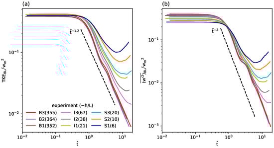 Time series of normalized (a) turbulent kinetic energy (TKE) and (b) vertical velocity variance, vertically averaged below . The black dashed lines indicate decay rates following a power law. The dimensionless stability parameters are given in parentheses after each experiment name.