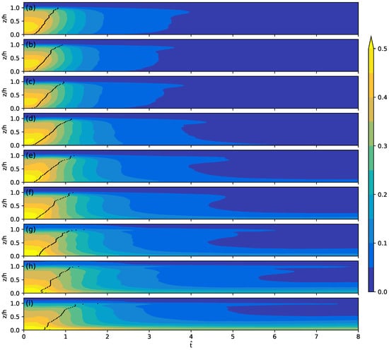 Time series of vertical profiles of normalized TKE in the (a) B3, (b) B2, (c) B1, (d) I3, (e) I2, (f) I1, (g) S3, (h) S2, and (i) S1 cases. The black dots below  indicate the times when TKE at  decreases by 10%.
