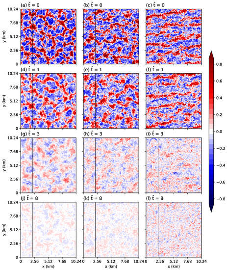 To illustrate the overall vertical circulations, normalized vertical velocities in PBLs (below ) are averaged and the vertically averaged  fields in the B3, I2, and S1 cases are presented in Figure 4. We select these three cases because they represent the buoyancy-dominated , intermediate , and strong wind-shear cases well. In the B3 case, convection cells are clearly seen in the vertically averaged  fields at  and the cellular structures are observed at  (Figure 4d) and even at  (Figure 4g). It is remarkable that the cellular convections at  = 1 and 3 are out of phase. For example, the vertically averaged  at (x, y) = (2.23 km, 6.97 km) is positive at  = 1 and negative at  = 3 and vice versa at (x, y) = (2.23 km, 5.77 km). In the S1 case, convective rolls appear and decay over time (Figure 4c,f,i), and local eddies replace them at  = 8 (Figure 4l). Intermediate structures between the cells and rolls appear in the I2 case [], and they also decay over time. However, the reversal of vertically averaged  observed in the B3 case is hardly detectable in the same fields of the I2 and S1 cases. Thus, we expect that wind shear acts to block or disturb the reversal of vertical circulations.