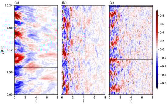 To illustrate more details of the boundary layer circulations, we present the time series of the normalized and vertically averaged vertical velocity at (x, y) = (2.23 km, 0–10.24 km) in Figure 5. In the B3 case, the temporal reversal of vertically averaged  repeats along with the decay of turbulence. The existence of oscillations even in this smoothened vertical velocity field indicates that boundary-layer scale oscillations exist. The time series of  profiles at the two points (x, y) = (2.23 km, 6.97 km) and (2.23 km, 3.09 km) confirm the oscillations again, but the oscillations become weak and local after a period of several  (Figure 6a,b). The oscillations are not distinct in the I2 and S1 cases. In the two cases, convective structures decay and move eastward simultaneously, and thus pure temporal changes of  are hardly detectable in the time series at fixed locations (Figure 5b,c). The time series of  profiles in Figure 6c,d demonstrate again that turbulent eddies in the S1 case are more complex than those in the B3 case.