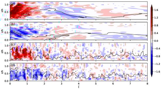 Figure 9 shows the time series of skewness (normalized third central moment) of vertical velocity . At  = 0, a top-heavy profile of skewness is observed in all the cases and the skewness decays from the bottom up. The skewness of vertical velocity in the upper boundary layer is quite large for some time (e.g., larger than 0.8 for  = 0–0.5 in the B3 case) and then decays quickly as the boundary-layer-averaged TKE decays. However, the skewness near the surface decays right after the cutoff time. Especially in the B1–3 cases, the near-surface skewness becomes negative at  = 0.3–0.4 and a negative-skewness regime forms and extends upward at  = 2–3. This upward extension and later shrinkage seem to be related to the reversal of vertical circulations seen in Figure 5a, and this indicates that downdrafts in the lower boundary layer play an important role in the decay of convective turbulence. In the S1–3 cases, the near-surface skewness decreases but much slower than in the B1–3 cases and small negative skewness is observed after a period of several convective time scales. The negative third moment of w in the surface layer was reported in the neutral PBL simulated by Moeng and Sullivan [] but note that the small negative value can be erroneous due to missing subgrid vertical velocity variance []. Right above the level of negative skewness, positive skewness of vertical velocity occurs and the positive-skewness regime extends upward over time in the S1–3 cases. The profiles of vertical velocity skewness in the I3 and I1 cases resemble the profiles in the buoyancy-dominated (B1–3) cases and those in the strong-shear (S1–3) cases, respectively, and quite intermediate profiles of vertical velocity skewness appear in the I2 case.