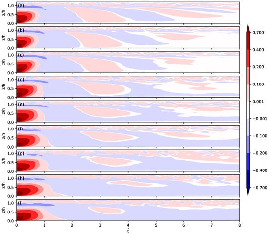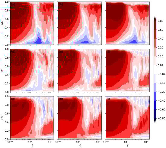 Time series of vertical profiles of normalized vertical heat flux in the (a) B3, (b) B2, (c) B1, (d) I3, (e) I2, (f) I1, (g) S3, (h) S2, and (i) S1 cases.