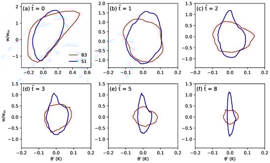 Joint probability density functions (PDFs) of potential temperature perturbation and normalized vertical velocity in the B3 and S1 cases at  = (a) 0, (b) 1, (c) 2, (d) 3, (e) 5, and (f) 8. Contours of the value 0.1 are plotted.