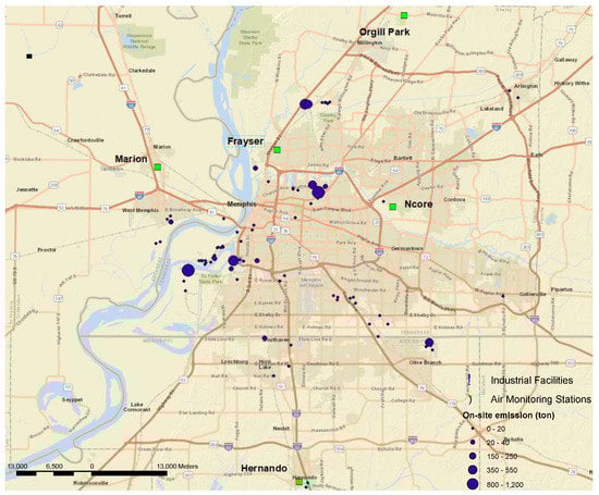 The current study is based on a recognition of the need for detailed evaluations of lockdown impacts on air quality using in situ monitoring data. A detailed analysis focused on even a single region could provide useful insight into this timely topic. This study aims to examine whether a reduction in air pollution occurred during the lockdown period in a typical mid-size U.S. metropolitan city. The Memphis Metropolitan Area served as the testbed in this study. This area is also known as the Mid-South Region, with Memphis as the central city. Known as the “Distribution Center of America”, Memphis is a major Mid-American commercial and transportation hub. The primary air pollution emission sources in this area include industries, airports, trains, truck corridors, highways, and ships on the Mississippi River. Southwest Memphis houses clustered heavy industries, including a refinery and a natural gas power plant (Figure 1). Memphis has the busiest airport for cargo traffic [], the third-largest rail center, and one of the largest inland ports in the nation. The Lamar Avenue corridor in Memphis is home to the newly enlarged BNSF Rail Yard used primarily for freight off-loading operations and brings thousands of train cars and trucks daily through the area. Major highways include Interstate 40, 240, 55, and 385, and their inner-city segments all have high traffic volumes of >50,000 vehicles/day []. With all these industrial and traffic emission sources, we hypothesized that the “stay-at-home” policy would significantly reduce air pollution during the lockdown period.
