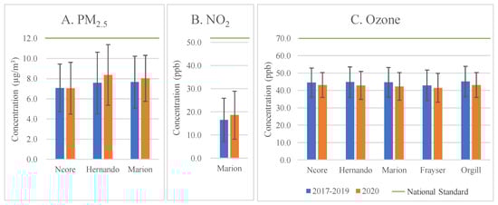 Comparison of average concentrations of PM2.5, NO2, and ozone in the Memphis Metropolitan Area between lockdown period (25 March–4 May, 2020) and the baseline period (25 March–4 May, 2017–2019). The green lines indicate the annual national standards. The error bars indicate the standard deviations.