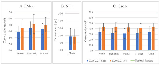 Comparison of average concentrations of PM2.5, NO2, and ozone in the Memphis Metropolitan Area between the lockdown period (25 March–4 May, 2020) and the prior month (25 February–24 March, 2020). The green lines indicate the annual national standards. The error bars indicate the standard deviations.