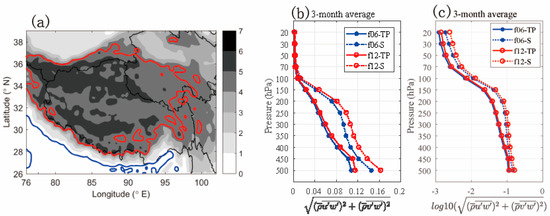 (a) Terrain height (unit: km; shading). The thin black lines are the province border. The red line represents the topography height at 4.5 km. The blue line represents the topography height at 0.3 km. (b) Area-averaged and 3-month-averaged horizontal momentum fluxes per unit volume (unit: Pa) and (c) common logarithm (base 10) of area-averaged and 3-month-averaged horizontal momentum fluxes per unit volume (unit: Pa) over the main TP (solid lines) and the south slope of the TP (dotted lines) from 6-h forecast results (blue lines) and 12-h forecast results (red lines). Legends in (b,c) are abbreviations of the simulation information. For example, f06 (12) refers to the 6(12)-h forecast. TP refers to the main TP region and S refers to the south slope of the TP.