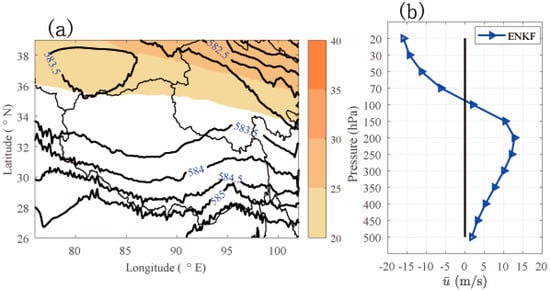 (a) Zonal wind speed at 200 hPa (shading: greater than 20 m/s; contour interval is 5 m/s) and geopotential height at 500 hPa (thick black lines). (b) Area and 3-month-averaged zonal wind (blue triangle line) varying with height.
