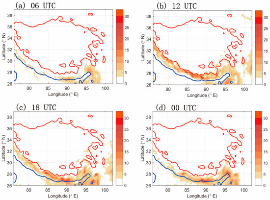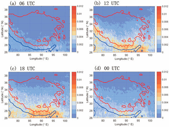 Geographic distribution of absolute horizontal momentum flux per unit volume (unit: Pa; shading, contour interval is 0.00109 Pa) at 30 hPa for 12-h forecast results at (a) 06 UTC (12 LT), (b) 12 UTC (18 LT), (c) 18 UTC (00 LT), and (d) 00 UTC (06 LT). The horizontal wavelength is taken from 10 km to 500 km. The red line represents the topography height at 4.5 km. The blue line represents the topography height at 0.3 km.