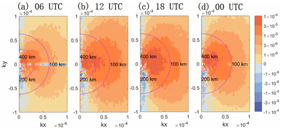 Time-averaged zonal momentum flux power spectra at 30 hPa in horizontal (kx, ky) wavenumber space for 12-h forecast results at (a) 06 UTC, (b) 12 UTC, (c) 18 UTC and (d) 00 UTC.
