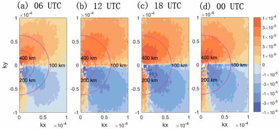 Time-averaged meridional momentum flux power spectra at 30 hPa in horizontal (kx, ky) wavenumber space for 12-h forecast results at (a) 06 UTC, (b) 12 UTC, (c) 18 UTC and (d) 00 UTC.