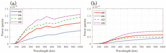 Quantitative analyses of the power spectrum varying with horizontal wavelength at 30 hPa are shown in Figure 8. For zonal momentum fluxes (Figure 8a), the strongest power curves happen at 12 UTC and 18 UTC. The power spectrum of the meso-scale wave increases fast for the wave with a wavelength of 70–500 km. In detail, the gravity waves with shorter wavelengths (70–200 km) are more active in late afternoon (12 UTC). Such small-size waves could be excited by convection [55]. Waves with longer horizontal wavelengths (greater than 200 km and less than 500 km) are strongest at midnight (18 UTC). This implies that the energy contributed by meso-scale atmospheric processes becomes strongest at 18 UTC. The weakest power curve is at noontime (06 UTC).