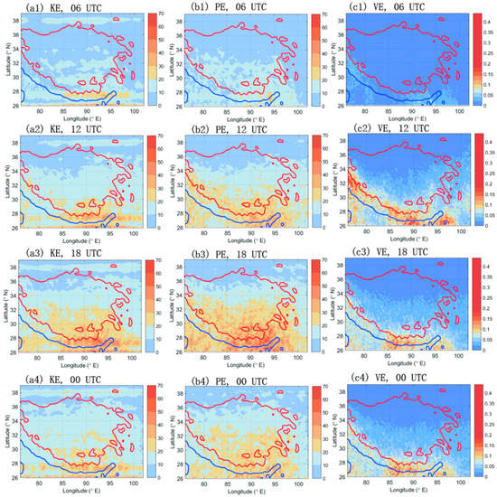 Time-averaged (a1–a4) KE (unit: J/kg, shading, c.i. = 10), (b1–b4) PE (unit: J/kg, shading, c.i. = 10), and (c1–c4) VE (unit: J/kg, shading, c.i. = 0.02; due to the large amplitude oscillation at different times, same red color uses for VE value greater than 0.2) at (a1–c1) 06 UTC, (a2–c2) 12 UTC, (a3–c3) 18 UTC, and (a4–c4) 00 UTC at 30 hPa.