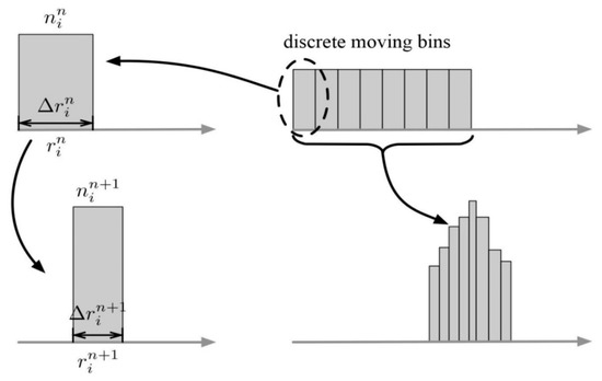 The framework of the new Lagrangian advection scheme is described in this section in detail. In cloud physics, the advection equation describing the evolution of the CDSD through diffusion growth was given by Rogers and Yau (1989) [26]. If we discretize the CDSD into bins, the equation can be written as follows: