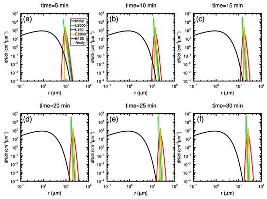 Figure 2 shows the time evolution of the cloud drop spectra from the analytical and numerical solutions. Cloud drops with radii smaller than 8 made up the main body of the initial spectra, which resulted in rapid growth in the first 5 min of the simulations. The spectra moved rightward and became narrower, as shown in Figure 2a. By referring to the raw output data from the models, the peaks of the spectra moved from 0.8 at the initial time to about 8.0 at 5 min. The peaks of the spectra from EAS (both 130 and 2000 bins) were located at the right-hand side of those from the LAS and the analytical solutions, indicating the cloud drops grew slightly faster with the EAS. It should be noted that the spectra from the LAS were much narrower than those from the EAS, which could also be observed in the following times. The shape and position of the cloud drop spectra with the LAS was in good accordance with the reference analytical solutions, indicating the results produced by the LAS were reliable. A major advantage of the LAS over the EAS was that the former scheme did not suffer the cloud drop spectrum spurious broadening issue. Simulations results from the EAS with 130 and 2000 bins also showed that the spurious broadening of the cloud drop spectra could be alleviated but not eliminated by increasing the bin resolution.
