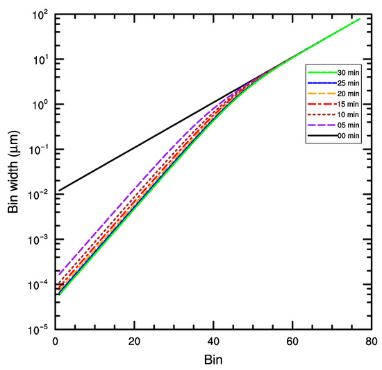 In LAS, the bin width was explicitly advanced by solving Equation (6). Figure 3 shows the time evolution of the bin width from the LAS with 130 bins. Only the first 77 bins were assigned with cloud drops and advanced. As for the first 60 bins, the bin width decreased with time. For bins with large initial radii, the width almost remained constant due to extremely low growth rate. The width of bins with small initial radii reduced sharply in the first 5 min and reduced rather slowly after 10 min. For instance, the width of the first bin was at initial time, at 5 min, at 10 min, and at 30 min. The width of the 60th bin was 11.00 at initial time, 10.94 at 5 min, 10.89 at 10 min, and 10.67 at 30 min. These characteristics can be taken into account in future cloud model developments.