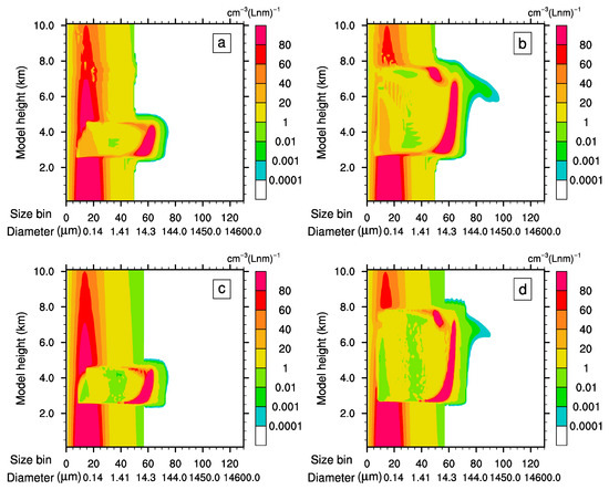 Figure 6a,c shows the evolution of the vertical profile of the liquid water content and the vertical wind. In general, the distribution pattern of the liquid water content with LAS was close to that with EAS. However, the maximum value with LAS was lower than that with EAS. The maximum value with EAS exceeded 2.0 , while that with LAS was lower than 2.0 . Lower concentrations of large cloud drops (diameter larger than 25 , on the right-hand side of the 65th bin) as well as raindrops with LAS might have in part accounted for this distinction. The time evolution of vertical wind profile with LAS was also close to that with EAS, with simulated maximum speed between 10 and 12 . Figure 6b,d shows the evolution of the vertical profile of the supersaturation ratio and the temperature. Two zones of high supersaturation values could be observed, one at the cloud base and the other one at the cloud top. The peak value at the cloud base has been found in previous studies by parcel cloud models [35,36,37]. However, one theory claims that the expansion and cooling of ascending moist air parcel above the cloud top results in the cloudy air becoming supersaturated with condensation rather than evaporation at the interface of cloudy air and clear air [1]. It should also be noted that the supersaturation ratio with LAS was noticeably lower than that with EAS at the cloud base. Note that the supersaturation is determined by both the vertical velocity and the condensation rate. Since the little difference of velocities and the big difference of cloud droplet concentrations at the cloud base lead to much more consumption for supersaturation water vapor with high droplet concentrations in the simulation with LAS, it is reasonable that the supersaturation ratio with LAS was lower than that with EAS at the cloud base.