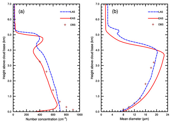Figure 5 shows the vertical distribution of cloud drop number concentrations and cloud drop mean diameter above the cloud base. The FSSP sample particles were 0.5 to 47.0 in diameter. For comparison with observations, the particles from the 31st bin (0.5 ) to the 70th bin (45.3 ) were used to calculate the model results at 52.5 min (same as Figure 7a). The EAS gave a slightly better simulation of the particle number concentrations except at the lower levels, while the LAS overestimated the number concentrations at the middle and upper levels. The preset initial CCN concentrations in the model may deviate from the actual value and influence the simulated particle concentrations. The right-hand side panel of Figure 5 shows the particle mean diameter within the range of FSSP. The LAS gave an accurate reproduction of the mean diameter from the cloud base up to 3.2 km, while the EAS overestimated it. Moreover, the deviations with EAS increased with height to more than 2 . The data were not sufficient to compare the LAS and EAS near the cloud top.
