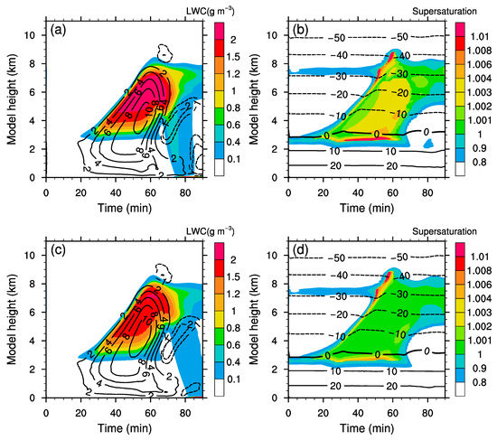 Spatial and temporal evolution of the thermodynamic variables with the Eulerian advection scheme (a,b) and the Lagrangian advection scheme (c,d). (a,c) Liquid water content (shaded area) and vertical wind (solid and dashed lines) (unit: and ) as a function of time and height. (b,d) Supersaturation ratio (shaded area) and temperature (solid and dashed lines) (unit: none and degree Celsius) as a function of time and height.