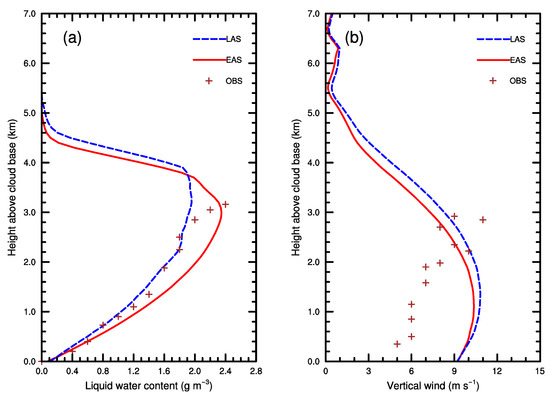 Comparisons between model results at 52.5 min with LAS, EAS, and OBS. (a) Liquid water content. (b) Vertical wind.