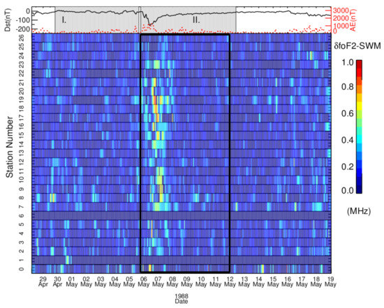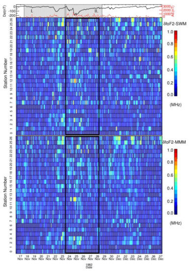 As shown in the upper panel of Figure 1, a strong geomagnetic storm started at 1800 UT on 5 May 1988 (shaded area in period II). The value of the geomagnetic Dst index (black line) then rapidly decreased and reached its minimum value (−160 nT) at 1000 UT the next day. Finally, it recovered to quiet time level after 10 May. During the corresponding period, the geomagnetic AE index also increased to 1334 nT. Before the geomagnetic storm (period I in Figure 1), the value of Dst remained around zero for more than a week, and the AE index was also generally at a quiet level. During this period, δfoF2 for the 27 ionosondes did not indicate any intense ionospheric disturbance. When entering period II, the ionospheric disturbances detected by most of the ionosondes are very strong, because δfoF2 rise above 0.8 for a dozen hours (lower panel of Figure 1). However, the goal of this paper is not to prove that the ionospheric disturbance derived by SWM can respond to the geomagnetic activity effectively, as this has already been verified [7,18,20]. In order to prove that the weak ionospheric response to an intense geomagnetic activity is a real geophysical phenomenon, not an artifact of the algorithm, MMM will be used as a comparison method for a weak ionospheric response event during a stronger SGS. As shown in Figure 2, another geomagnetic storm started at 1000 UT on 23 November 1982, and reached its minimum value (−197 nT) at 1700 UT the next day, and the geomagnetic AE index reached 1500 nT. Obviously, this geomagnetic storm event was more intense than the previous one, but the δfoF2 for this period at most ionosondes did not show a strong ionospheric disturbance (<0.6). The two events are compared—the first (Figure 1) with an isolated storm, and the second (Figure 2) with a preceding storm, and it can be seen that their ionospheric responses were very different, especially during period I. In the 1988 event, geomagnetic activity was very quiet in period I, and the corresponding ionospheric state was also very quiet. However, in the 1982 event, there was a geomagnetic storm in period I (as indicated by the Dst index), in which ionospheric disturbance was observed.