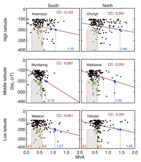 Scatterplots between the minimum of Dst (DstM) and the corresponding max value of (MVA) during all geomagnetic storm events (Dst < ‒100 nT), for six selected stations from high to low latitudes in the Northern and Southern hemispheres. The shaded area is the region chosen for weak response events. The blue square is the MVA calculated using the linear fit (red lines) with a Dst of ‒200 nT. The CC is the Pearson correlation coefficient between DstM and MVA.