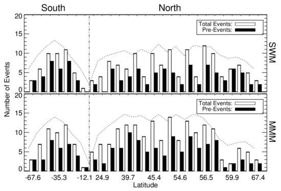 In the example of Figure 2, where the previous storm appeared to suppress the response to the following storm, the interval between the storms was very short. This can be considered as a special SGS event that is referred to as “SGS-PRE” in this paper. To explore whether this special SGS event can contribute to the weak ionospheric response in the second storm, 21 SGS-PRE events have been further selected with the additional condition that the time interval between the SGS and its preceding geomagnetic storm (Dst < −40 nT) is no more than seven days. The numbers of ionospheric weak response (derived by SWM and MMM) to SGS-PRE events (black bars in Figure 4) are also shown in Figure 4. The weak response to SGS-PRE shows a similar latitudinal trend to the response to SGS.