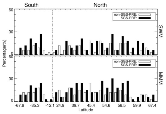Latitudinal distribution of ionospheric weak response events with and without super geomagnetic storm with a preceding storm event (SGS-PRE) as a percentage of all super geomagnetic storm (SGS) events. Black (white) bars denote the percentage of ionospheric weak response with (without) SGS-PRE events. The upper panel is the result derived by the spectral whitening method (SWM), and the lower panel is derived by the monthly median method (MMM).