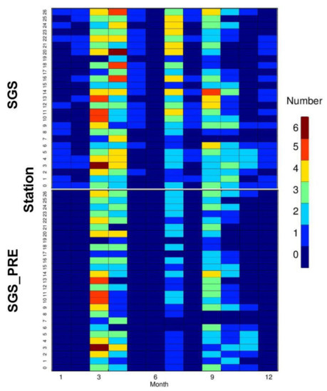 To explore the seasonal variation in the ionospheric weak response, the monthly variation in the number of weak ionospheric response events is studied. As shown in the Figure 6, the number of weak events for 27 ionosondes can be observed in different months. In the SGS events, obvious seasonal dependence can be found in all ionosondes, and the weak response events easily occur in March/April (spring) and September (autumn). Further exploring the SGS-PRE events, the similar seasonal dependence can be also clearly observed. As a result, in the both of storms and preconditioned storms, the weak events occur mainly at the spring and autumn equinox. In March, the number of weak events is same between SGS and SGS-PRE in all stations. However, in the other months, it seems that there are obvious differences between SGS and SGS-PRE in many stations. In general, the number of SGS is larger than that from SGS_PRE. It is a noteworthy that the maximum number of geomagnetic storms is observed precisely during the equinoxes, and it may be small in other moths [24]. In fact, the events of SGS are also maximum during the equinoxes, and the number of SGS events are very few in other months (not shown here). It may result in the maximum of weak ionospheric response to SGS during the equinoxes.