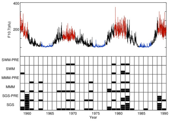 Daily F10.7 from 1959 to 1990 (upper panel; red and blue denotes solar activity high years and low years respectively) and the number of events each year (lower panel; one black rectangle represents one event). SGS means all super geomagnetic storms (Dst < −200 nT) during the period 1959–1990. Similarly, SGS-PRE means an SGS with a previous geomagnetic storm within no more than seven days. MMM and SWM show the number of ionospheric weak response events to SGS; MMM-PRE and SWM-PRE are the number of ionospheric weak response events to SGS-PRE.