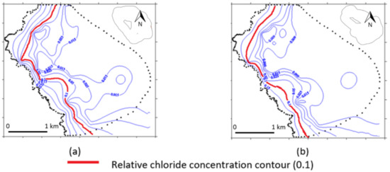 Results of numerical simulations for Kiti pilot area: Relative chloride concentrations (a) for the base hydrological year (end of dry period), and (b) for extreme dry hydrological year, based on the MPI- RCA4 model under the RCP 4.5 scenario (end of dry period). Relative chloride concentration of 1 expresses the seawater chloride concentration (22 g/L). [32].