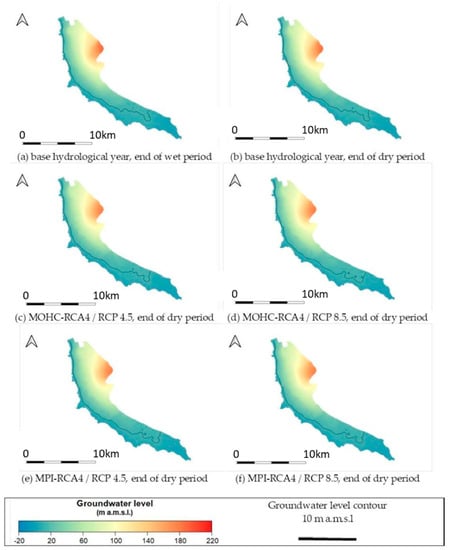 Figure 4 presents the results of the simulation runs at the end of the dry period (end of September) for the base hydrological year and the future year under both RCPs for the case of the Pegeia aquifer. Based on the analysis of extreme dry climatic projections, produced by the MPI-RCA4 and the MOHC-RCA4 models, no additional pressure in groundwater availability is foreseen for both RCP 4.5 and 8.5. Climatic projections for meteorological variables, produced by the MPI-RCA4 and the MOHC- RCA4 models, show an increase in precipitation, even for an extreme dry hydrologic year, compared to that of an average historic hydrological year. Therefore, an average increase in the groundwater levels of 0.6–2.3 m, is predicted for the dry season of a predicted extreme dry hydrologic year (compared to an average hydrological year). The largest increase in groundwater levels (2.3 m) is predicted for the RCP 4.5 scenario under the MPI-RCA4 model. For this case, a piezometric depression of ~−2.5 m is predicted for the central part of the agricultural zone. Concerning climate change impacts on salinization, the indicative results are presented in Figure 5. Specifically, the spatial distribution of chloride concentrations for (a) the base hydrological year (at the end of dry season), and (b) for the predicted extreme dry hydrological year, based on the MPI-RCA4 model and RCP 4.5, are presented for comparisons reasons. As it can be concluded from Figure 4, it is predicted that seawater intrusion is slightly reduced under the RCP 4.5 scenario, in agreement with the estimated groundwater level spatial distribution, while predicted future chloride concentrations show an approximate 2-fold decrease.