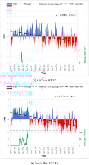 In Figure 7, the high SPEI values are consistent with water reservoir overflows during the historic years (e.g., in 1988 for the case of the Asprokremmos dam), while during a downward trend period of SPEI, the water reservoir storage is low. Therefore, the SPEI trend can be used as an indicator for the reservoir storage future trends. Although SPEI evolution shows a downward trend in all three locations under both RCPs considered and, therefore, more dry events are expected in future, the mean SPEI values for the future period (i.e., 2031–2060) range from −0.5 to 0, classifying the future period in a normal class, based on Table 2. However, it is important to note that there is significant increase in the frequency of extreme events (SPEI lower than −1.5).