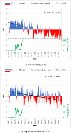 Besides the uncertainties associated with SPEI estimation related to the selected RCM and/or the PET method used, the results of the analysis are considered to be reliable as, in all of the locations near the three representative water reservoirs, (a) the historic drought events are depicted in the SPEI graphs (e.g., droughts on the early 1970s) and (b) the water reservoir storage can be correlated with the SPEI values. As time-series of climatic variables produced by RCM do not depict the actual chronological order, the SPEI should be used as an alarm indicator to identify future trends of water volume variability in the specific reservoirs, rather than be used as a method to predict the exact time of a water shortage in the examined reservoirs.