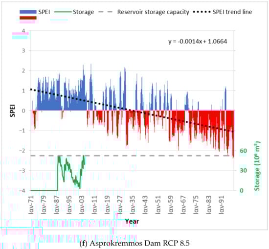 Figure 7e,f presents the SPEI evolution at the Aspokremmos dam for the period 1972–2098, forced by the RCP 4.5 and RCP 8.5 scenarios, showing a significant downward trend. In more detail, while the average SPEI values for the period 1972–2000 were 0.70 and 0.80 for RCP 4.5 and RCP 8.5, respectively, the corresponding average values of SPEI for the period 2031–2060 were −0.14 and −0.13.