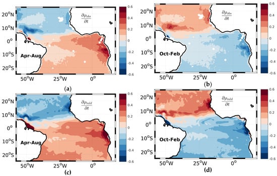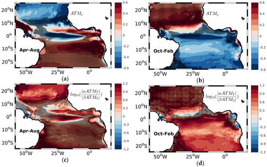 The dots in Figure 3a,b show regions where the atmospheric thermal (ATMTρ) and haline (ATMSρ) contributions to the ocean buoyancy flux act constructively (i.e., they have the same sign). During the boreal summer, both components generally act constructively in the southern hemisphere (poleward of 5° S, where it is winter locally) and destructively (i.e., they have an opposite sign) in the northern hemisphere poleward of 10° N. Again, the situation is opposite for the boreal winter. In the local summer, shortwave radiation is the major contributor to air-sea heat flux [,], which increase the mixed layer density while evaporation is the main component in freshwater fluxes. Hence, ATMTρ and ATMSρ do not have the same effect on buoyancy. Clearly, Figure 3a shows that the thermal effect dominates. In local winter, air-sea heat fluxes are controlled by latent heat fluxes, e.g., [], which increase the upper density while freshwater is still dominated by evaporation [] out of the ITCZ seasonal march. This explains ATMTρ and ATMSρ opposite effects on the buoyancy. Figure 3c,d show that the thermal term (ATMTρ) dominates by a factor of at least two () both in the winter and summer in the extra-tropical regions. Along the south Brazilian coast, the factor is greater than 10.