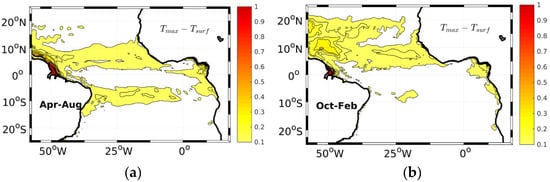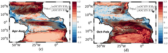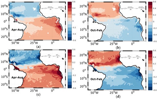 Around 10° S and between 10° N–20° N, horizontal processes are the major contributors to the buoyancy increase by ocean processes during both seasons. In addition, temperature and salinity variations act constructively (Figure 5a,b black dots). Thermal and haline horizontal components increase the upper water buoyancy by Ekman advection of warm and freshwater equatorial water, respectively []. Between 10° N–20° N, the horizontal haline contribution is at least three times greater than the temperature one (Figure 5c,d). Around 10° S, the thermal component is the main physical process determining the upper density change by horizontal processes. This is mainly due to transport of warm water from the equator by the Ekman transport. At the equator and along Senegal-Mauritanian coast, vertical processes are the major contributor to a buoyancy decrease by ocean processes. This is associated with the intrusion of cold and salty water into the mixed layer by vertical diffusion [,,] with a domination of thermal processes in the equator (Figure 6c,d). This suggests that the vertical gradient of temperature at the mixed layer base is more important for the buoyancy than the salinity along the equator. However, along the Senegal-Mauritanian coast vertical processes, mainly during the boreal autumn-winter, the vertical gradient of salinity at the mixed layer base is more important than the temperature. This could be due to input of freshwater from the Senegal river, which freshen the surface and increases the vertical salinity gradient.